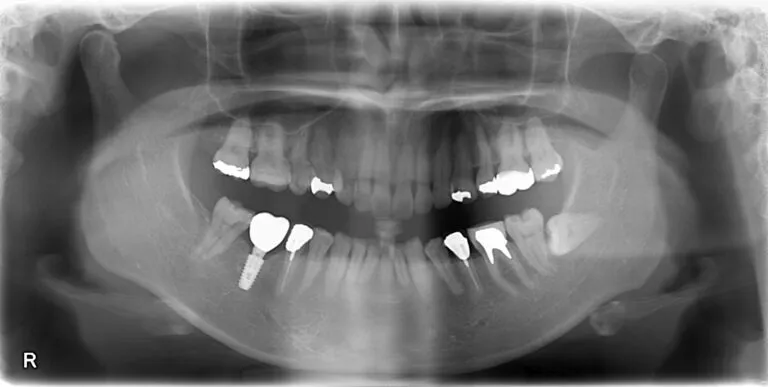 レントゲン画像の左下を注目ください。奥から二番目の歯にインプラントが入っているのがわかります。また画像左下の一番奥の歯に関しては特に大きく削る処置をしていないのが分かります。